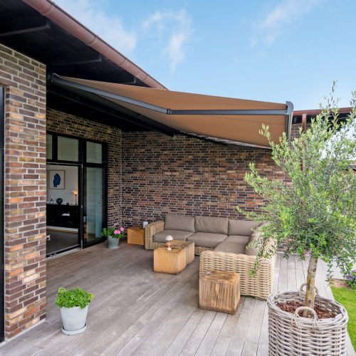Den kompromisløse 6760 knækarmsmarkise, kan leveres med et udfald op til 400 cm og op til 1200 cm i bredden.