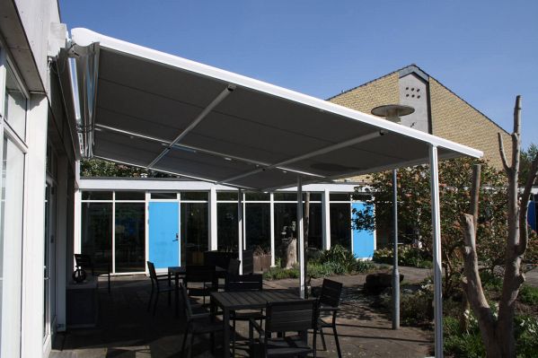 Pergolamarkisen løber langs glaspartiet, så man opnår en diskret løsning. Pergolamarkisen, der kun leveres med motor, er udstyret med modtræk, så dugen altid er spændt helt ud.